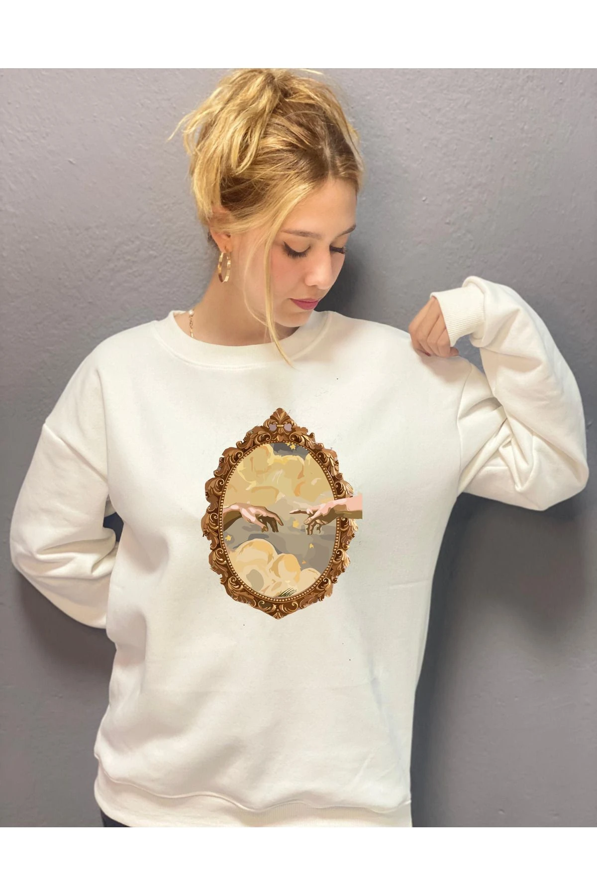 AYNALI GÖRSELİN PARMAKLARIN BULUŞMA BASKILI 3 İPLİK ŞARDONLU SWEAT T.SHİRT