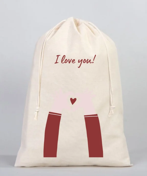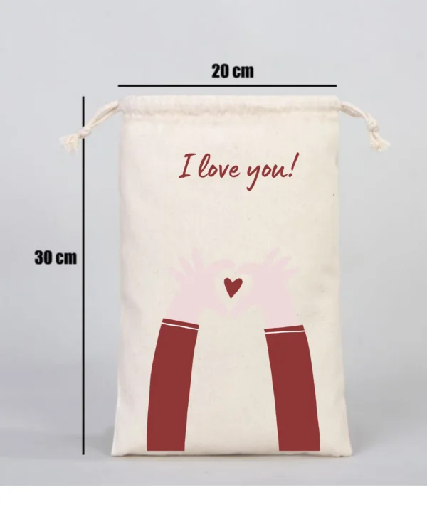 I Love You Kalp Yapan ElYazılı Kalp Motifli Hediyelik Ham Bez Kese (20cmx30cm)