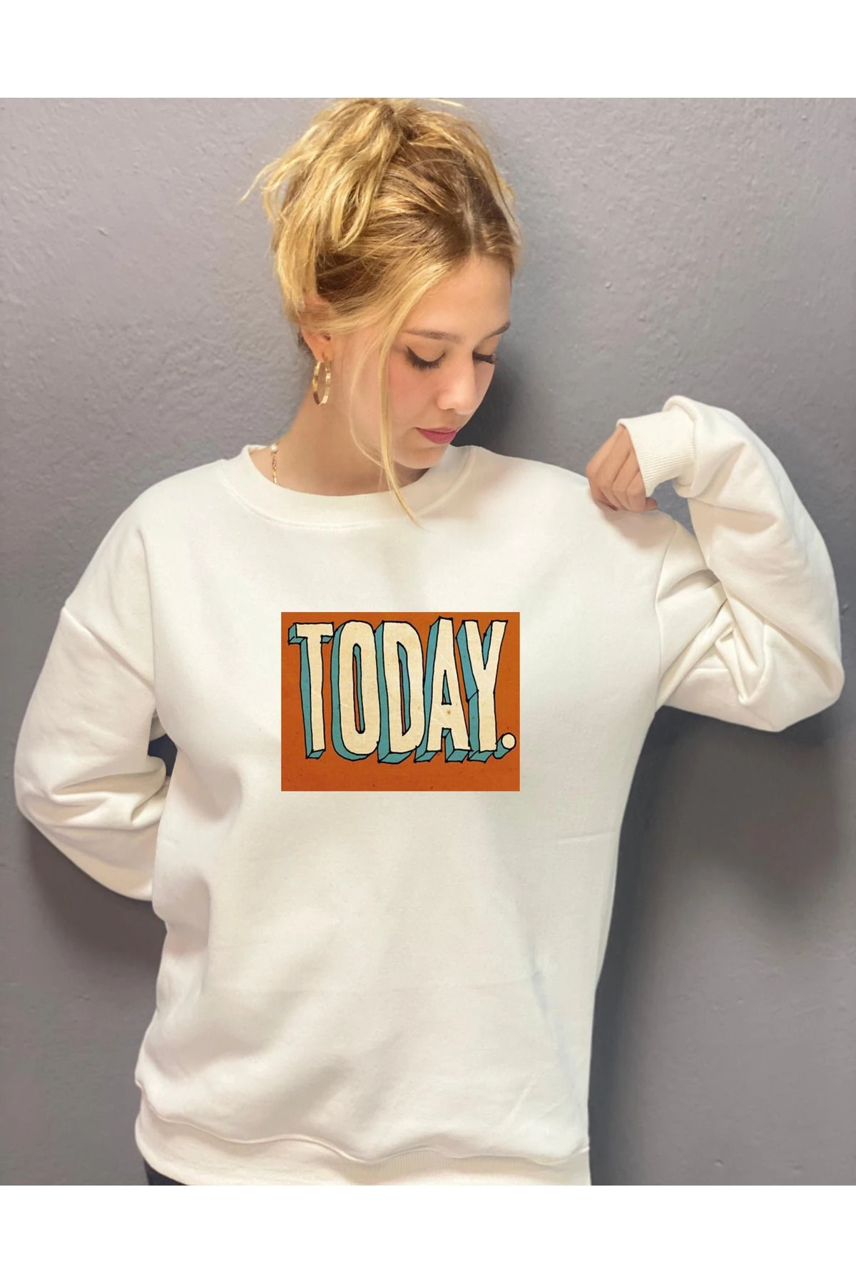 TODAY YAZILI BASKILI 3 İPLİK ŞARDONLU SWEAT T.SHİRT